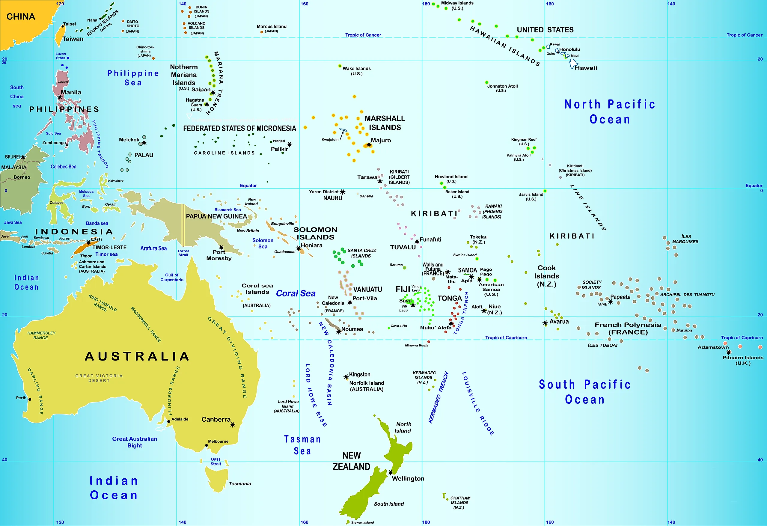 Some of the countries included in Oceania are Australia New Zealand Tuvalu Samoa Tonga Papua New Guinea the Solomon Islands Vanuatu Fiji Palau Micronesia the Marshall. Oceania is a region made up of thousands of island throughout the Central and South Pacific Ocean. Most of Australia and Oceania is under the Pacific a vast body of water that is larger than all the Earths continental landmasses and islands combined.