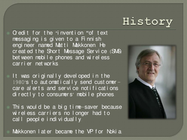 Ad You can use it to increase your sales on your website make videos on your youtube blog. The text messaging or Short Messaging Service SMS was invented in 1995 by Matti Makonnen of Finland who is known as the Father of SMS. Various companies played around with the idea but the SMS concept was developed in the Franco-German GSM cooperation in 1984 by Friedhelm Hillebrand and Bernard Ghillebaert.